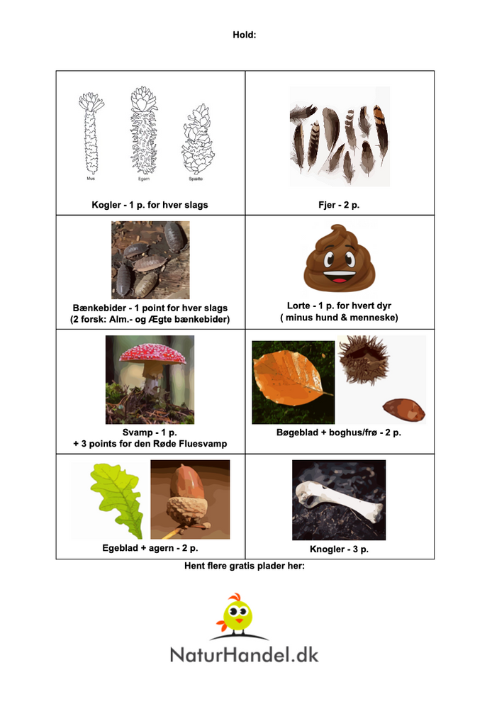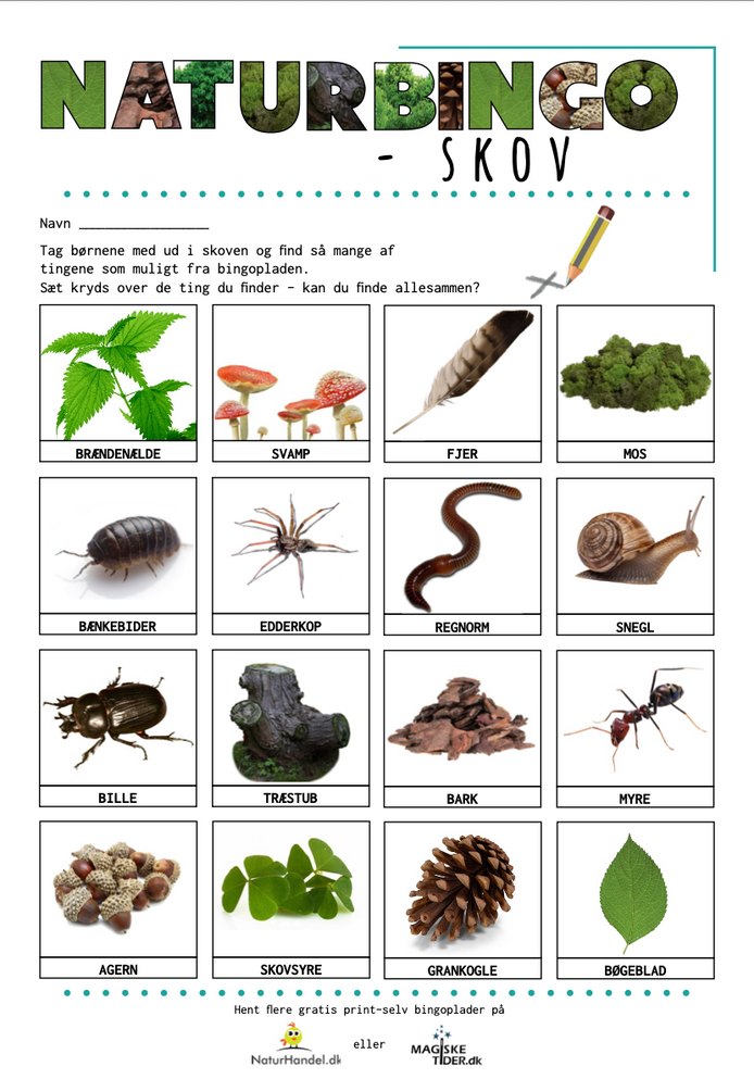 - I skoven: Find blade, svampe, kogler og smådyr. Kombinér med vores svampe plakat 🍄 eller Krible Krable Plakat 🐞 for at lære mere.