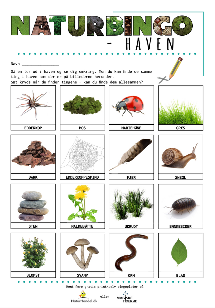 🌿 Print et ark, tag børnene med ud og spil NaturBingo næste gang I skal på tur – og lad legen fortsætte derhjemme med vores naturplakater og naturbøger.