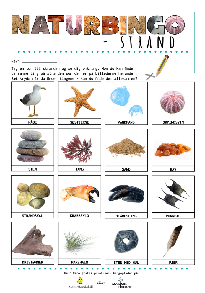 - Ved stranden: Kig efter muslinger, tang, måger og strandfugle. Se også vores fugleplakater – fx rovfugle plakaten eller plakaten med strand- og kystfugle.